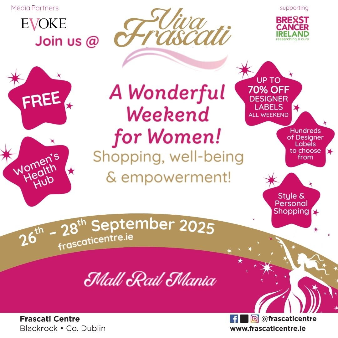 Celebrate. Empower. Enjoy. Grab the girls, get glam and visit Viva Frascati, a weekend dedicated to you. This FREE 3-day event is taking place from 26th to 28th September, and brings together discounted shopping, style, self-care and sisterhood – all under one roof at the Frascati Centre in Blackrock. With exclusive offers with up to 70% OFF 100’s of top brands, women’s health and wellness masterclasses, styling sessions, and a chance to support Breast Cancer Ireland, this is your opportunity to invest in yourself, your wardrobe, and your wellbeing. Whether you’re coming for the fashion, to bag a bargain, the talks, or to simply enjoy a fabulous day out with friends – Viva Frascati is a celebration of women, for women. So, gather your friends and make a day of it!
