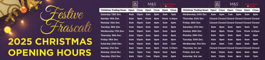 Frascati Centre is open Monday – Saturday 08.00am – 10.00pm and 09.00am – 09.00pm Sunday’s and Bank Holidays.